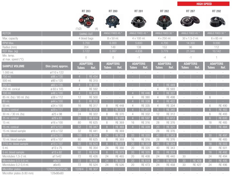 • Lid provided with security systems: - Automatic lid lock system, motorized with double lock. - Emergency lid-lock release. - Locking and protection against opening along the run. - Lid dropping protection. - Port in the lid for calibration and operation checking. • Unbalance detection and switch off. • Protection safety ring between the centrifugation chamber and the housing. • Chamber of centrifugation in stainless steel (easy cleaning). • Rotors can be removed with the lid closed. Hermetic lids. • Rotors and adapters autoclavable, easy to install by the user. • Automatic disconnection for energy saving up to 8 h, with deactivation option.