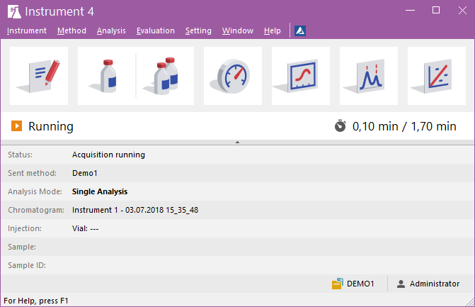 Clarity window![]() The Clarity window is an entrance point to individual chromatography systems. Depending on the configuration users can acquire data from up to 48 detectors configured on four independent Instruments. See Also: Clarity - Example of two instrument configuration Instrument window![]() The Instrument window is the control center of the whole process of data acquisition and evaluation. It includes information table displaying the processed sample: name, applied template method, acquisition mode, etc. The status line indicates the current state of the analysis: elapsed time and state. The analysis-processing diagram provides icons for fast access to every process of the whole procedure. See Also: Instrument window tutorial Chromatogram window