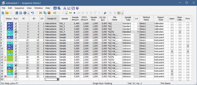 Sequence![]() The Sequence table can be easily edited, using the fill down the user can easily compose the sequence with many injections. The status of each row is indicated by the colored symbols.