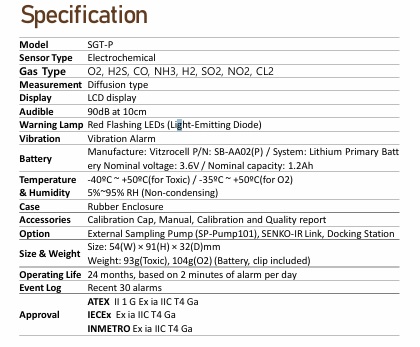 The Senko SGT-P Series is a Replaceable single-gas detector that user can replace a sensor or battery after 2-years lifespan. You can turn off the device whenever and battery life signal will let you know when it is time to replace the battery.