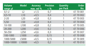 Low spring forces of pipetting stroke and tip ejector accommodate the daily work without hand fatigue. With ten pipette models the volume range is covered from 0,2 μl up to 10 ml.