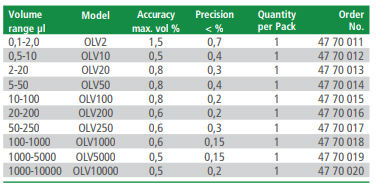 The volume range of samples from 0,1μl up to 10 ml is covered by ten pipette models. An ergonomic shaped handle and low spring forces contribute to reducing hand fatigue.