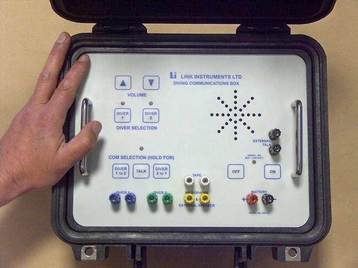 The DI01-2 Diving Communications Box is designed and manufactured by Link Instruments Ltd. The unit is robustly made in a waterproof Peli case with push button controlled which are easily operated even when wearing gloves. The unit uses 2 wires to connect to each diver and has all the features required when controlling one or two commercial divers.